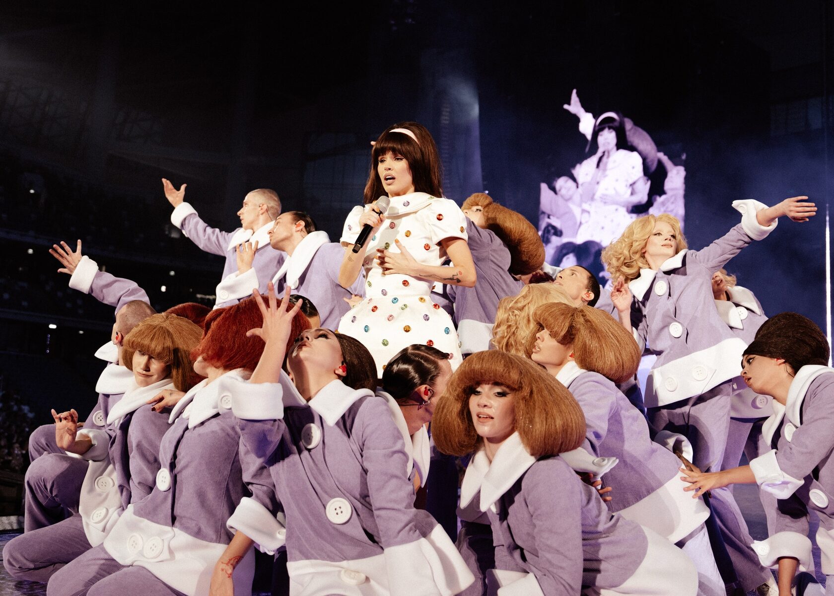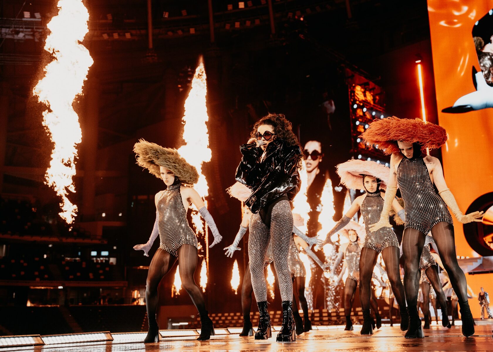 Оформление сцены стало самостоятельным произведением искусства. Над ней располагалась парящая платформа для музыкантов, а 40-метровый подиум буквально врезался в зрительный зал, стирая границы и создавая эффект полного погружения зрителя в этот аудио-визуальный перформанс. Более 1000 пиротехнических зарядов, синхронизированных с драматургией номеров, работали как точечные акценты, подчеркивая кульминацию каждого номера.