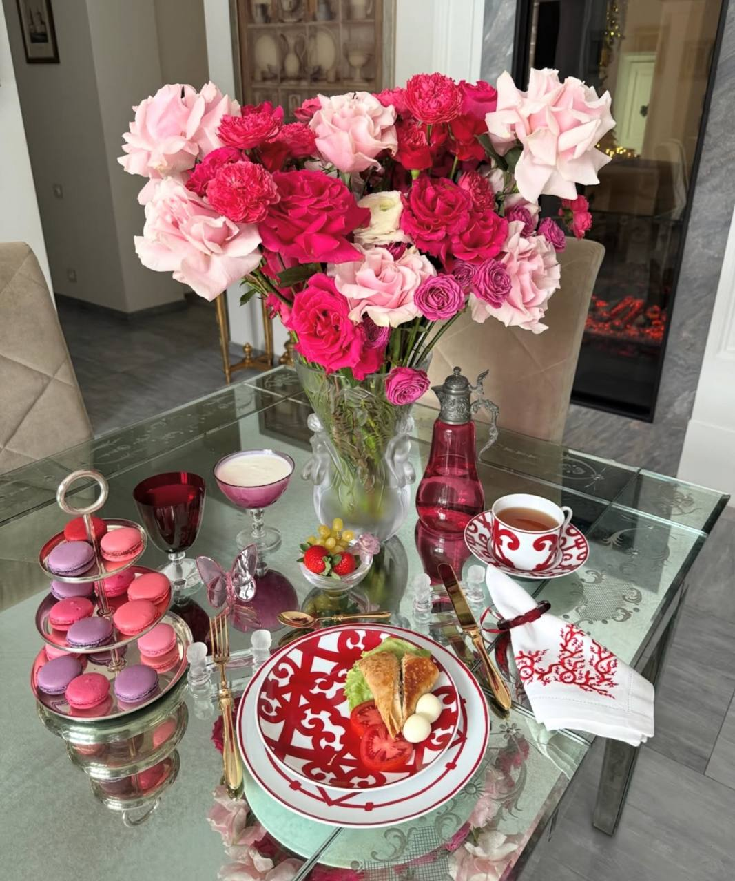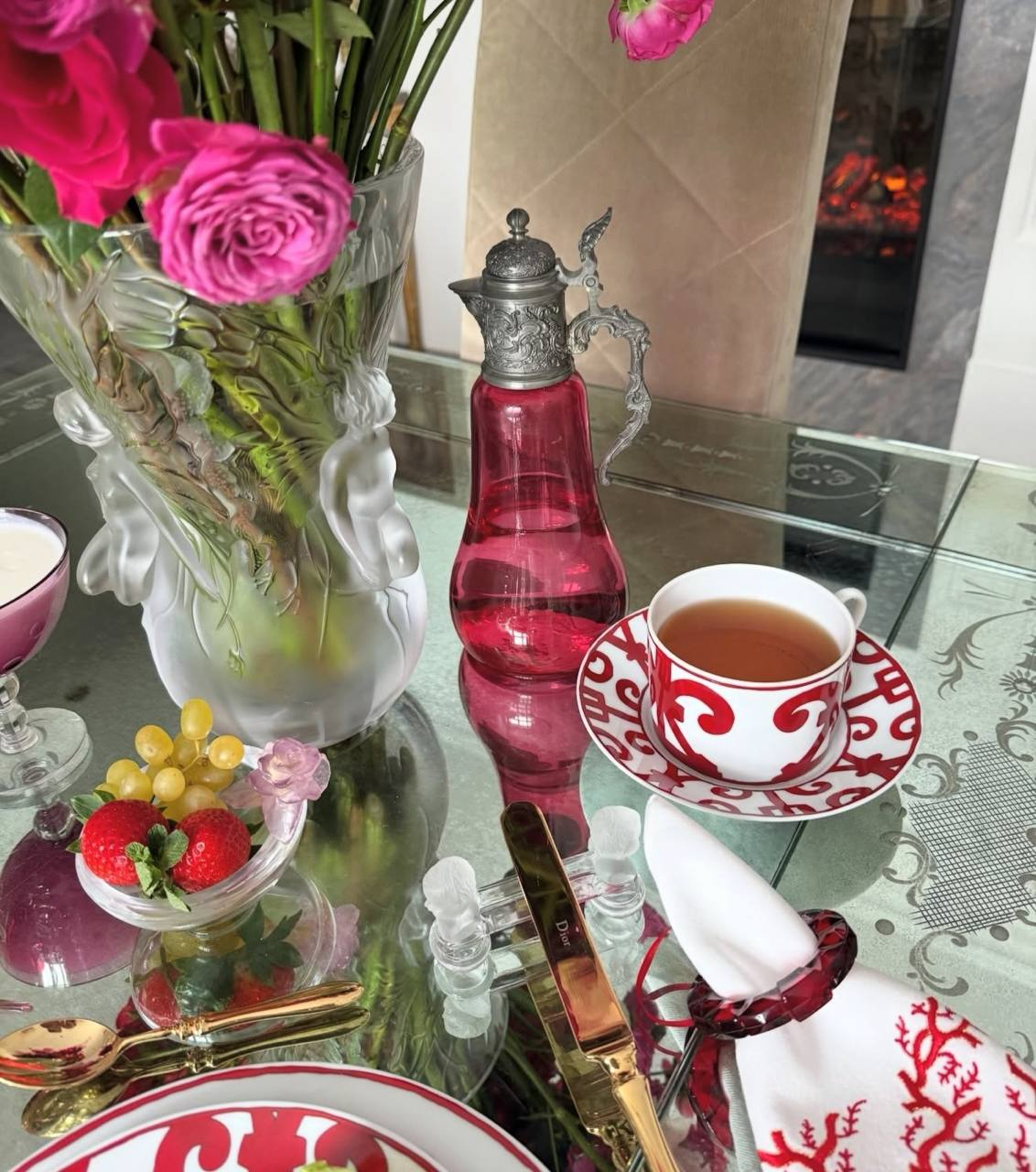Чай семья пьёт из фарфоровых чашек Hermes. Такой сервиз стоит около 35 тысяч рублей. Для горячих блюд у них отдельный обеденный сервиз того же бренда — он уже почти на 875 тысяч. Приборы на столе от Dior, примерно 9 тысяч рублей на человека. Для пирожных и конфет стоит этажерка за 145 тысяч. Бокалы хрустальные, Baccarat, почти 90 тысяч рублей.