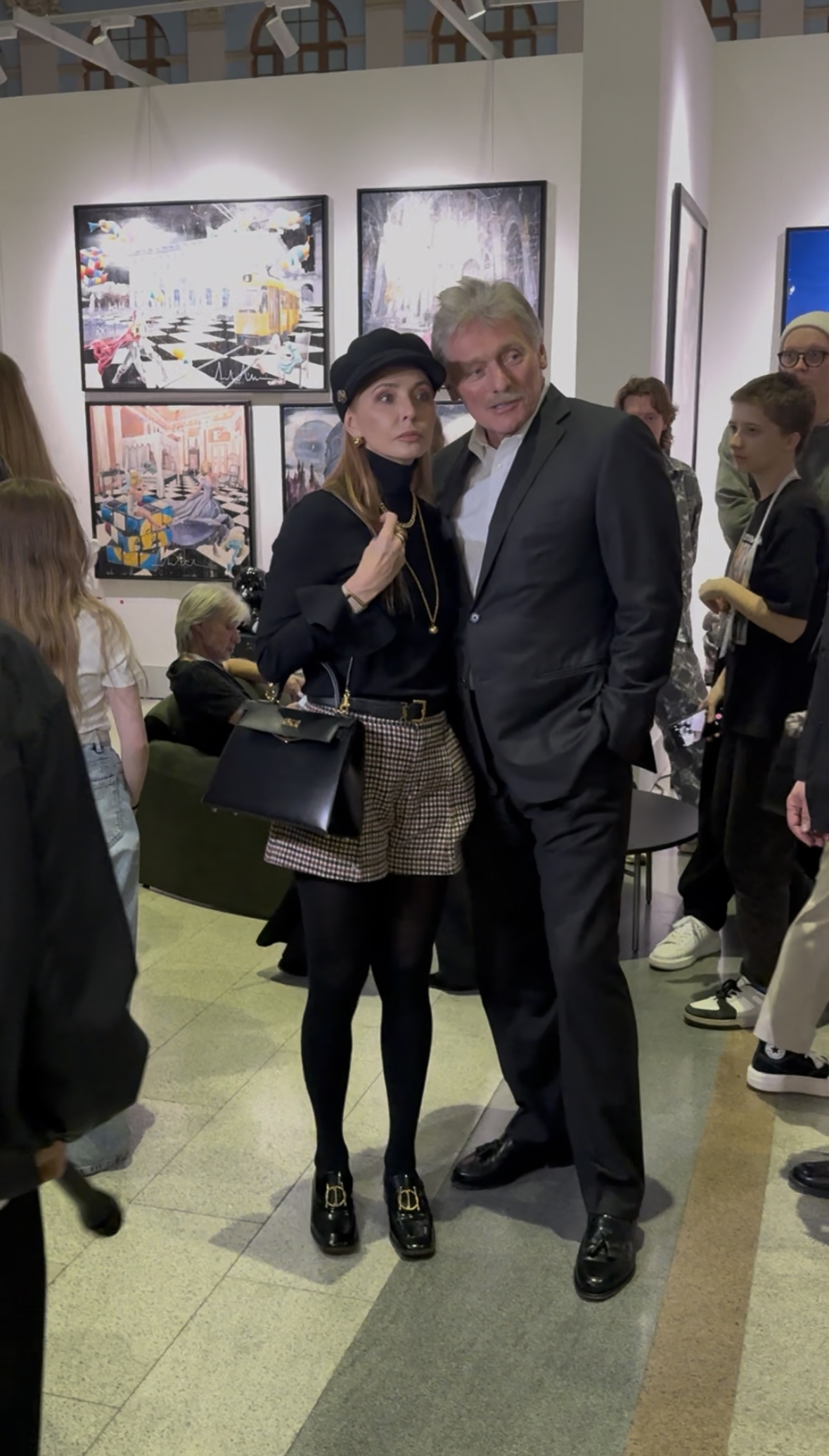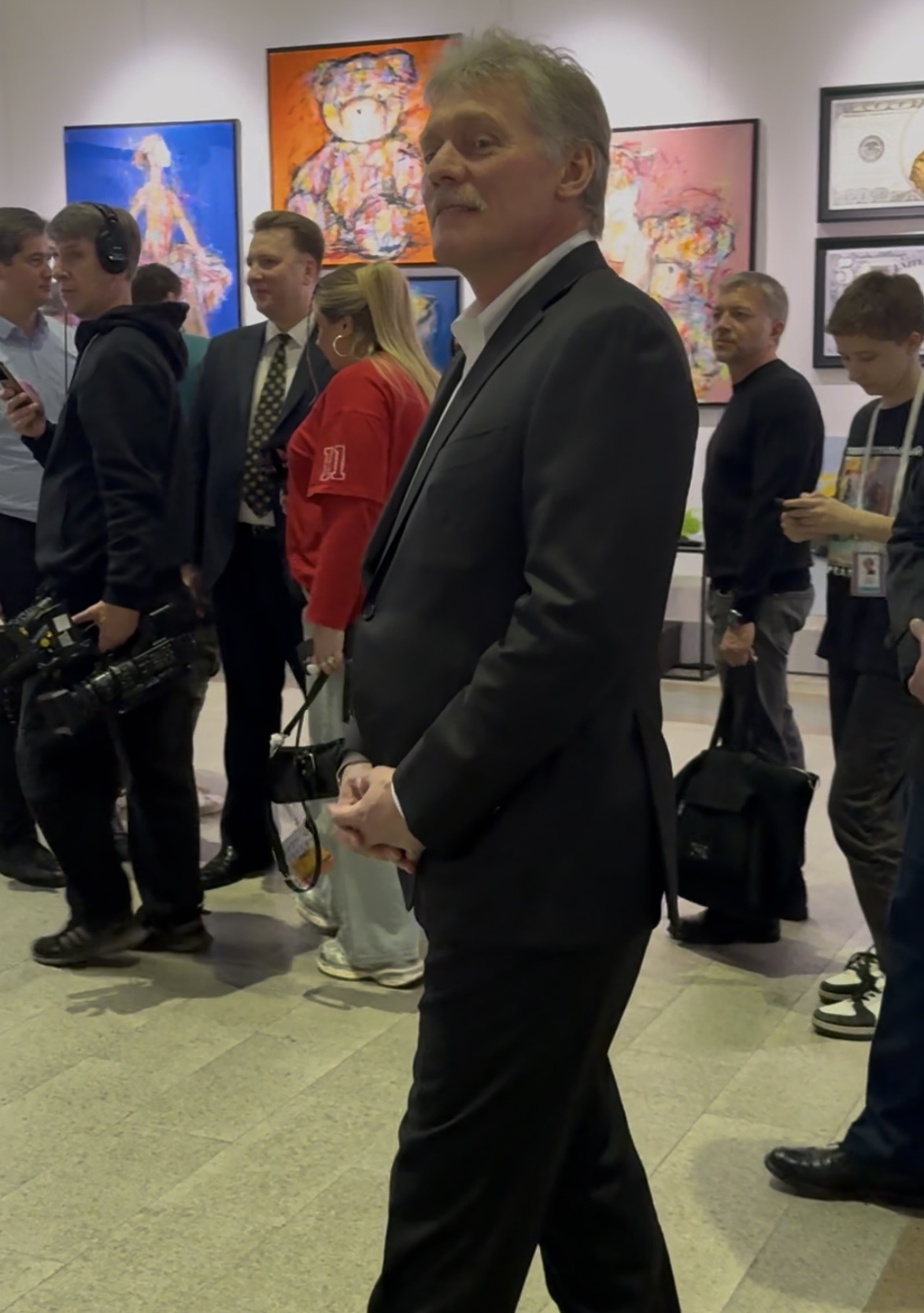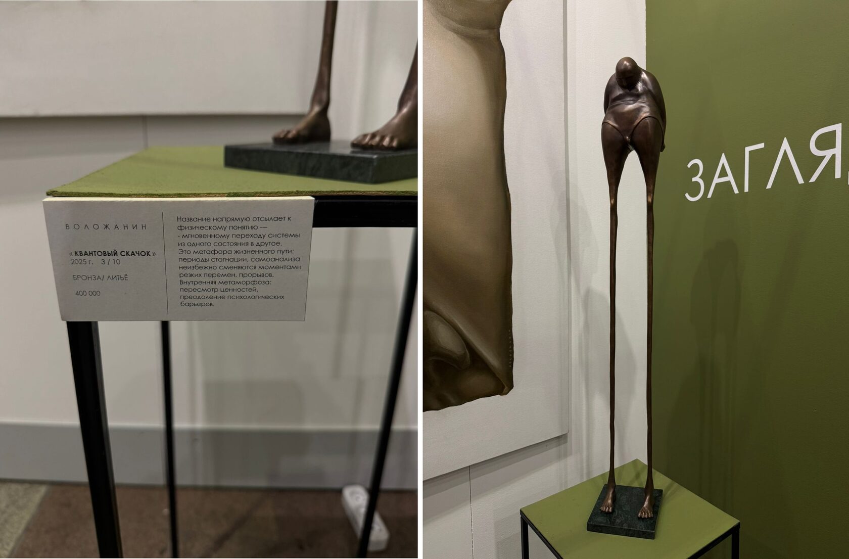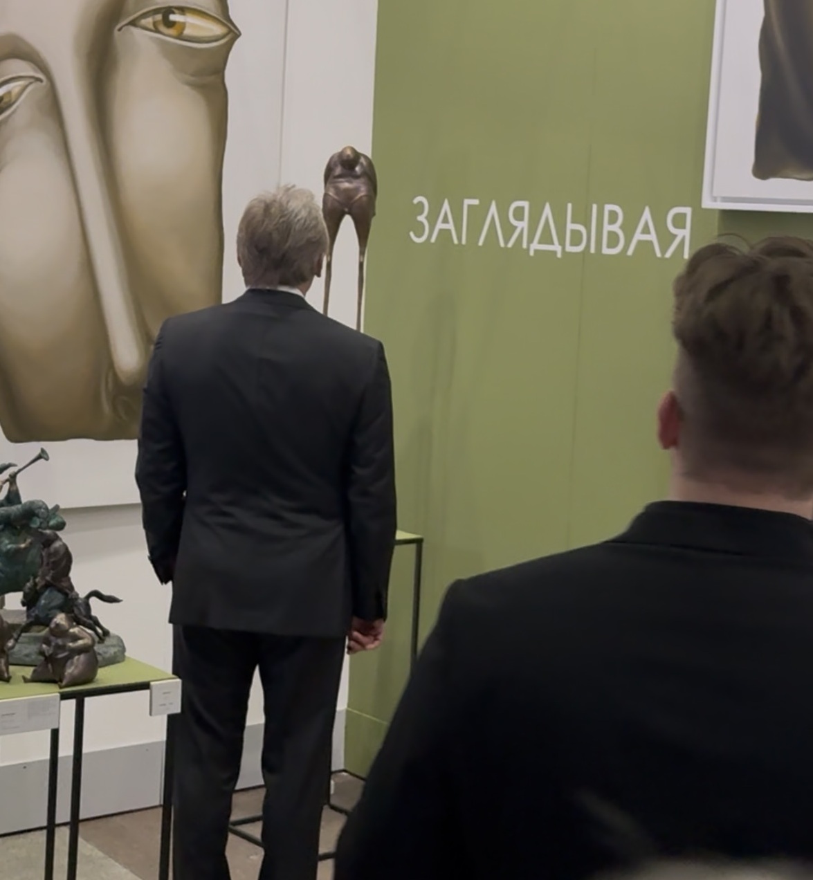 Дмитрий Песков свой пристальный взгляд обратил внимание на бронзовую фигуру скульптора Игоря Воложанина под названием «Квантовый скачок» стоимостью 400 000 рублей. Государственный деятель первоначально о чем-то посоветовался с Навкой, затем подошел к экспонату и внимательно его изучил. С учетом прилично потраченного времени Песковым на визуальный осмотр и описание, данная экспозиция его явно заинтересовала.