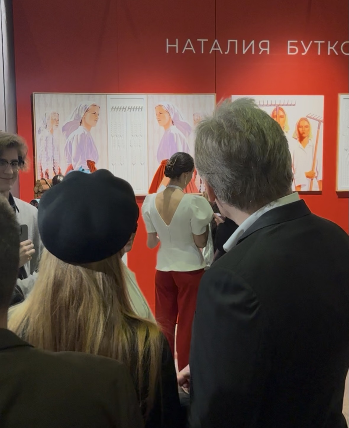 Уже следуя к выходу, Дмитрий Сергеевич короткое время изучил картину «Война и мир» (к сожалению автора не помню), а также полотна художницы Наталии Бутко, выполненные в красно-белом цвете и символизирующие труд в советском союзе. Женщины на картинах собирают сено, ворошат траву, разбивают комья земли.