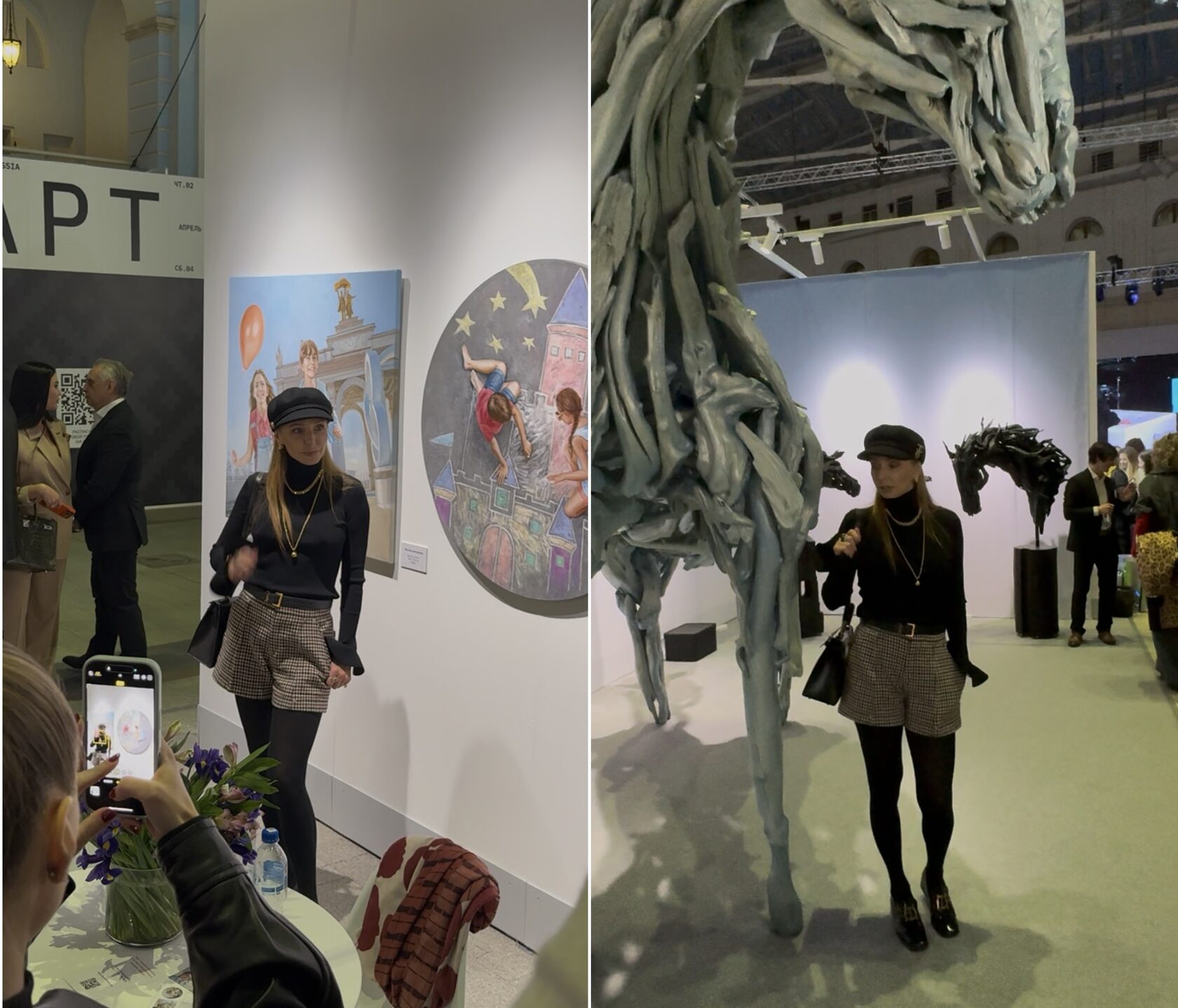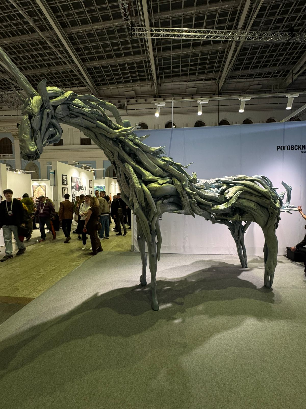 Также интерес Навки упал на высокую деревянную фигуру единорога скульптора Игоря Роговского. Фигуристка назвала инсталляцию конем ( и правда больше похожа на лошадь) и попросила помощника сделать пару кадров на телефон. Как удалось узнать, работа полностью сделана из коряг дерева, скрепленных между собой особым образом. Стоимость трехметрового голубого единорога составила 5,5 миллионов рублей, и он уже продан.