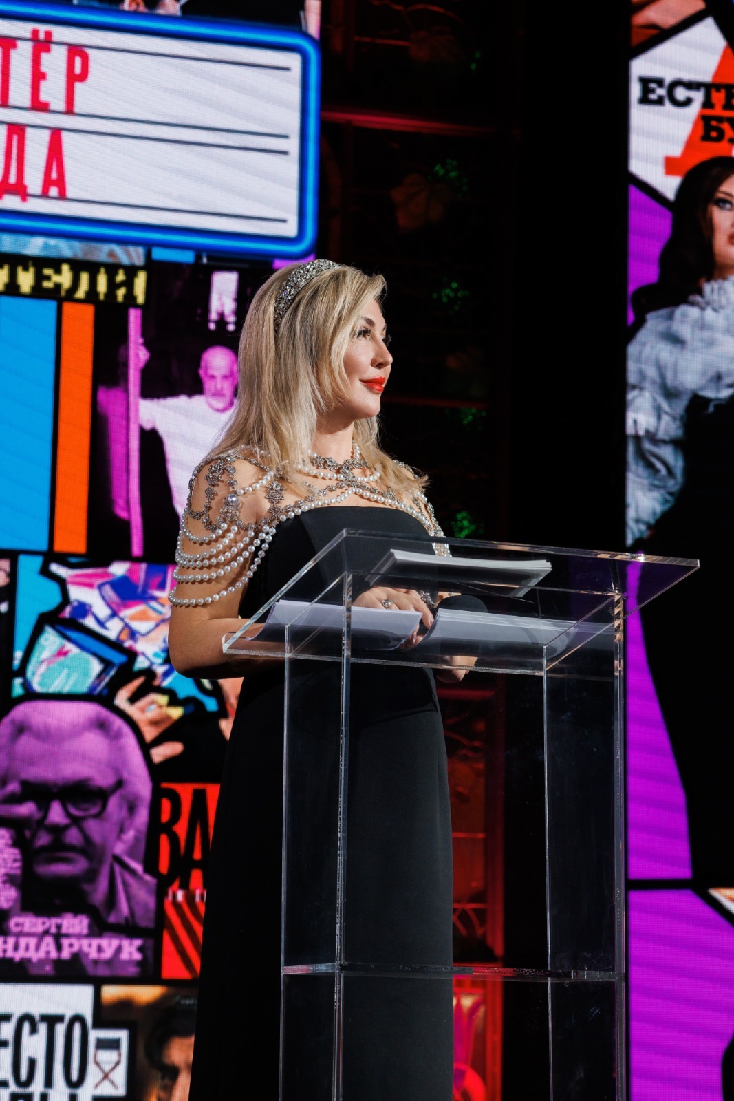 «Спасибо большое. Для меня большая честь. Здесь Андрей Сергеевич меня делегировал получить эту половинку звезды. Я, его половинка, держу его половинку звезды в руках. И он меня попросил передать слова благодарности людям, которые стояли за проектом, которые верили в проект», – сказала Юлия Высоцкая.