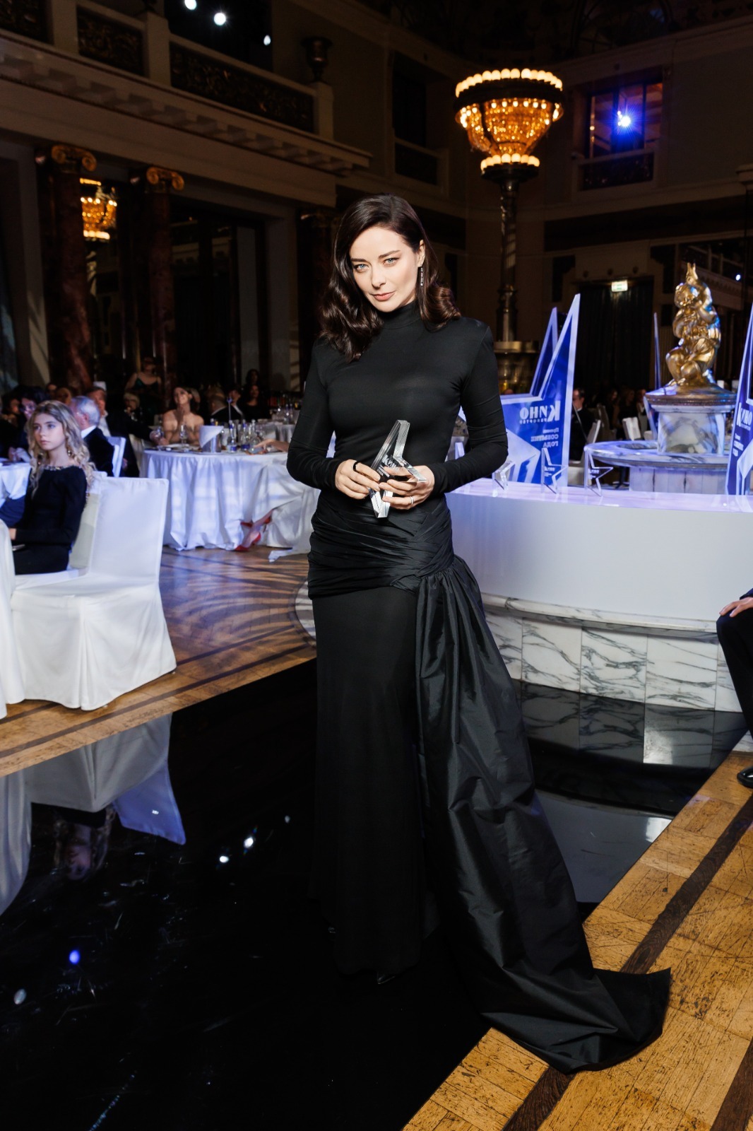 Именно в стенах гостиницы «Метрополь» в 1906 году открылся первый в Москве двухзальный кинотеатр – «Театр “Модерн”», ставший колыбелью столичной кинокультуры. А когда в 1926 году здесь устраивали одну из премьер фильма «Броненосец “Потемкин”», фасад здания был превращен в декорацию: его украсили изображением броненосца, развевающимися флагами и праздничной иллюминацией. Сегодня в этом историческом интерьере в свете софитов развернулось не менее впечатляющее и важное событие, объединившее людей, без которых невозможно представить современное российское кино и телевидение.