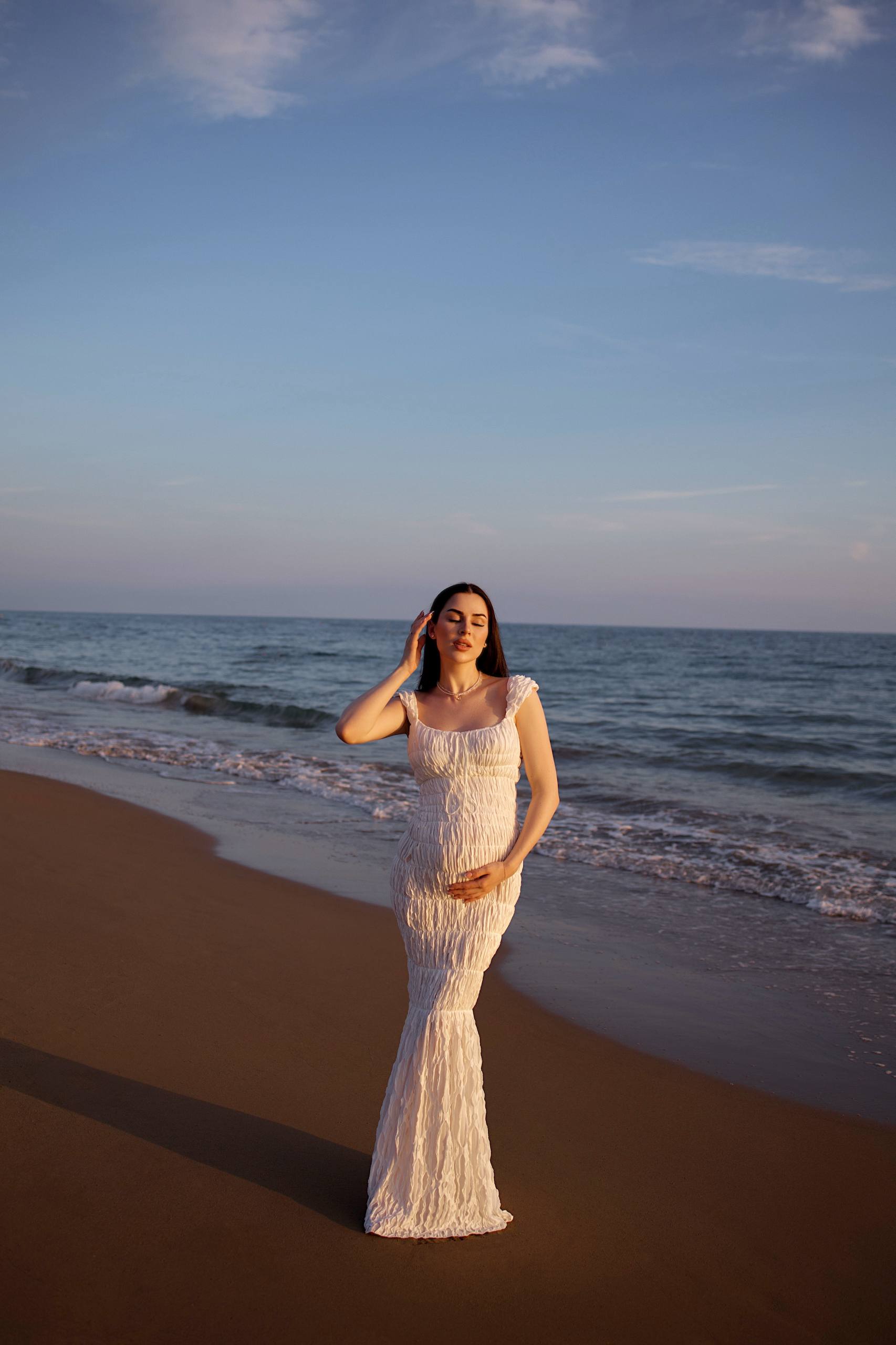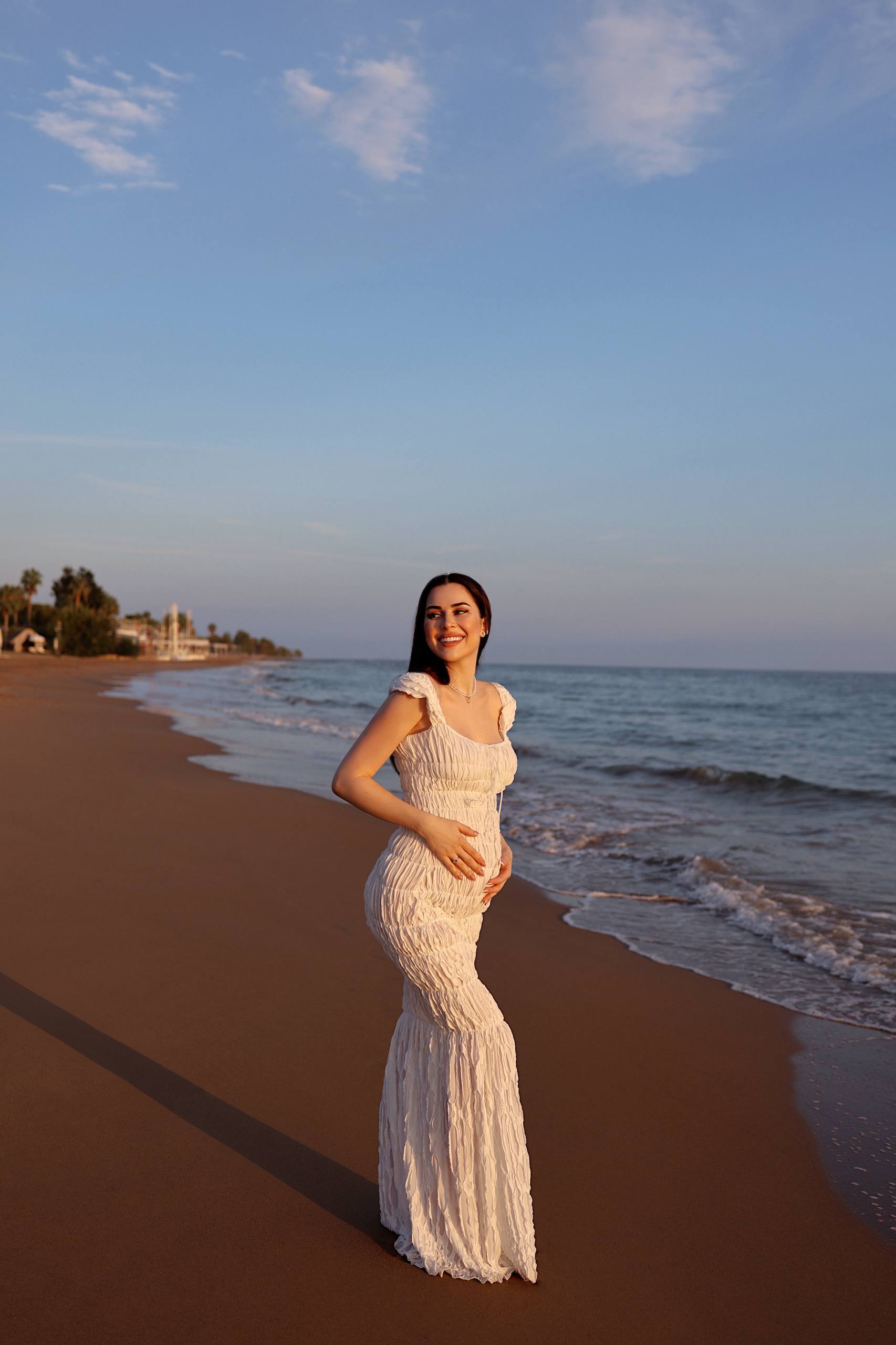 Для объявления о беременности Юлия выбрала романтический формат. Она опубликовала серию снимков, снятых на морском побережье, где предстала в белом облегающем платье, которое мягко подчеркнуло округлившийся животик. Блогерша с распущенными волосами и естественным макияжем выглядела сияющей и абсолютно счастливой.