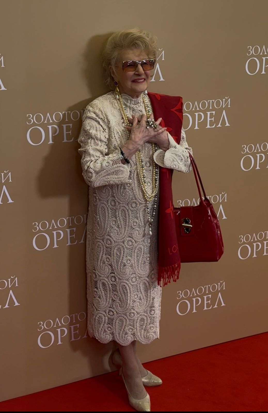 Для выхода актриса выбрала белое кружевное платье, дополнив его бордовым шарфом ЛуиВитон под тон сумочки, к слову не маленькой для таких случаев. А что, можно потом и в «Пятерочку» по дороге домой зайти и купить что-нибудь вкусное своему супругу легендарному кинооператору Анатолию Мукасею. Кто-то из журналистов даже успел спросить ее про отсутствие мужа, на что актриса ответила: «Толя в другом офисе». В пятницу в 20 часов? Вероятно, Светлана Дружинина слукавила, а Анатолий приболел и просто остался дома.