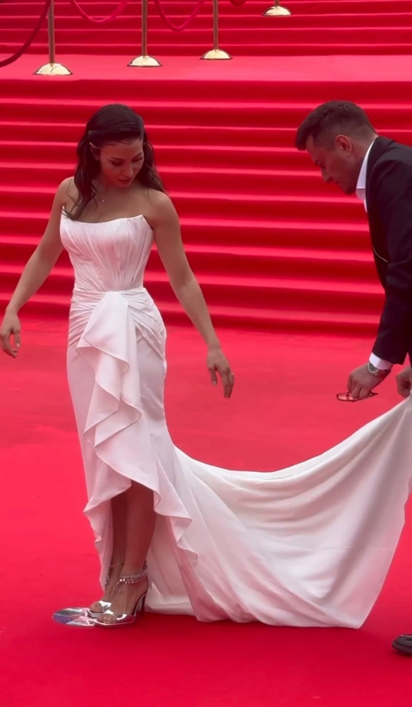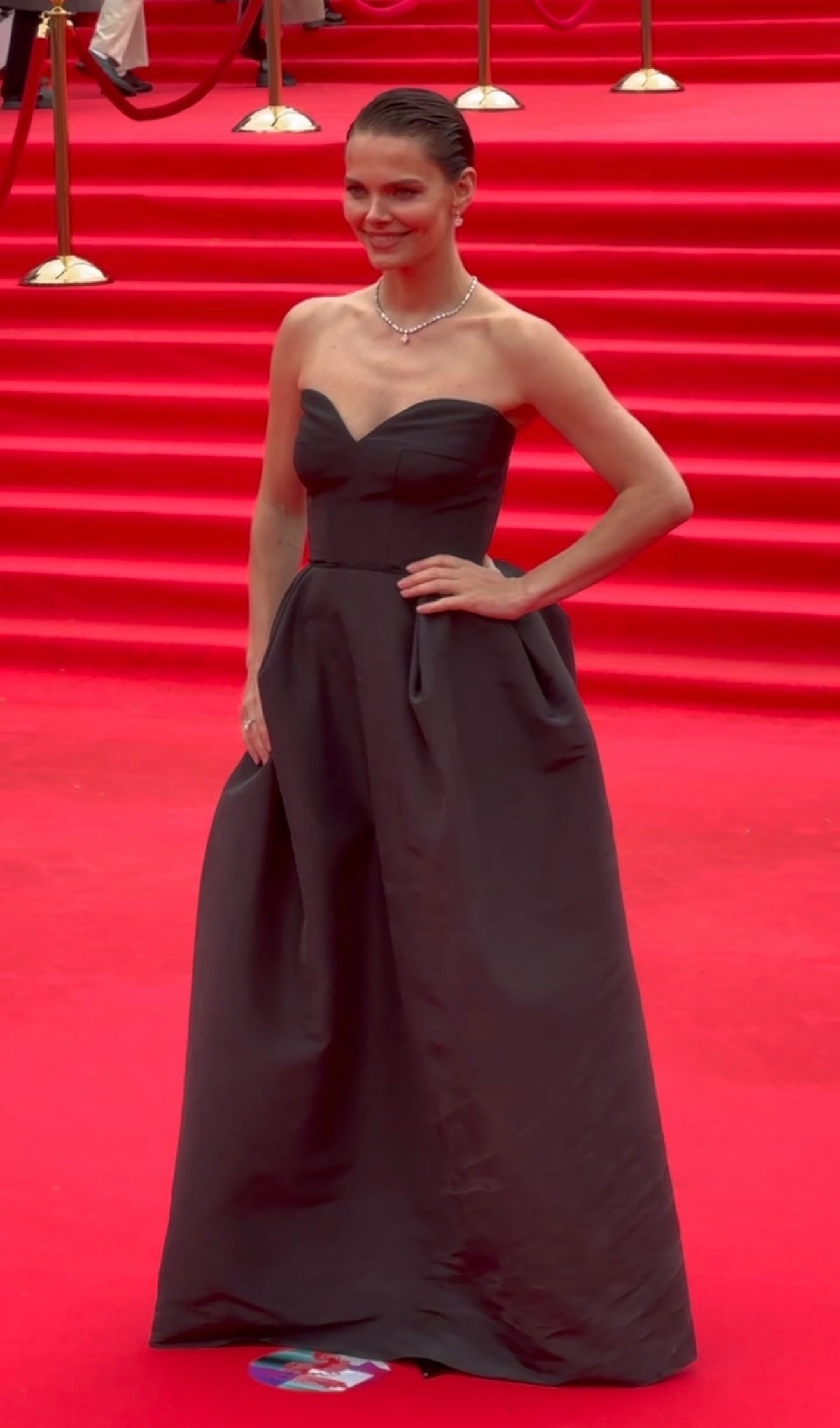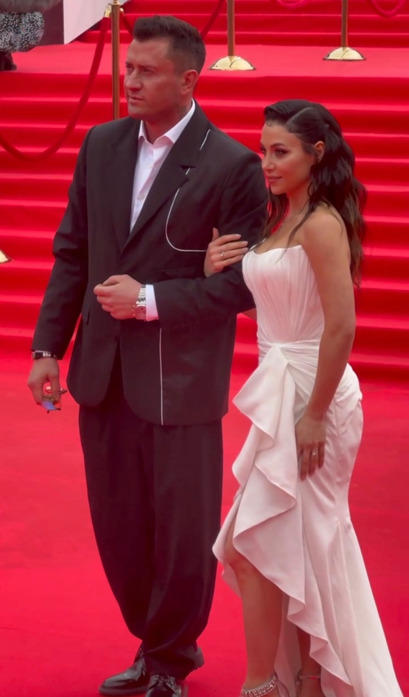 Павел аккуратно расправил этот шлейф на красной дорожке, помогая жене. Волосы Зепюр уложены свободными волнами, макияж неброский, на ногах — босоножки на каблуке. Пара выглядела гармонично: строгий образ Павла подчеркнул утончённость наряда супруги.