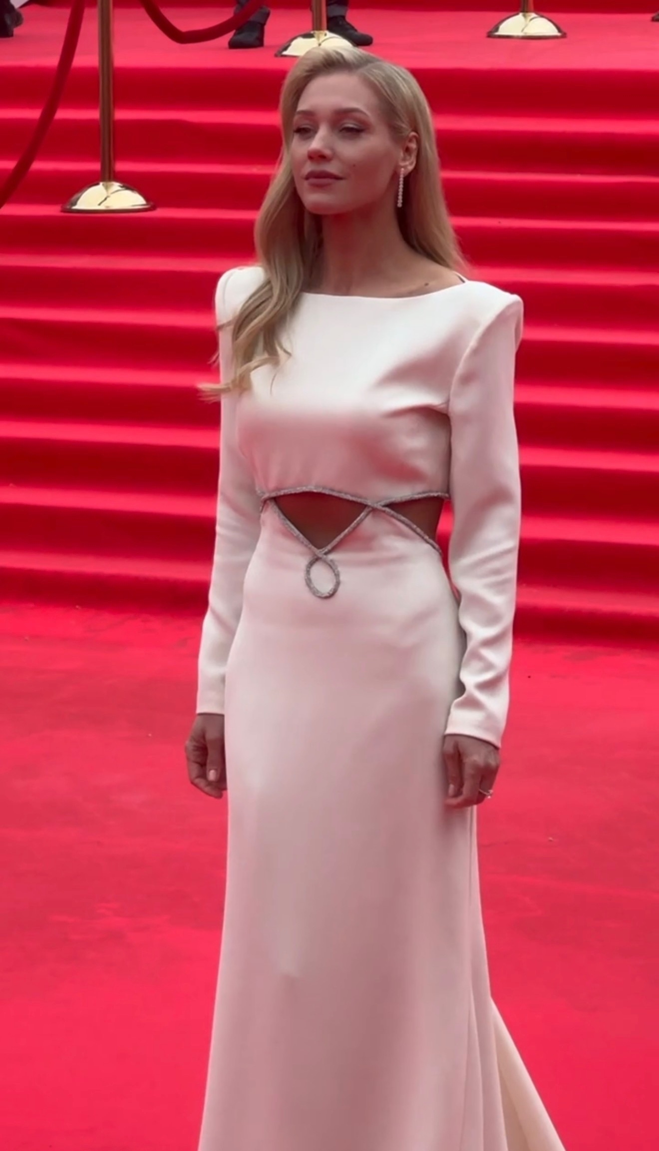 Актриса выбрала длинное белое платье в пол с лаконичным, но выразительным кроем. Главный акцент платья — фигурный вырез на талии, украшенный декоративной деталью в виде переплетённых линий с крупным кольцом в центре. Силуэт приталенный, плавно переходит в расклёшенный низ. Волосы уложены свободными волнами, спадающими на одно плечо.
