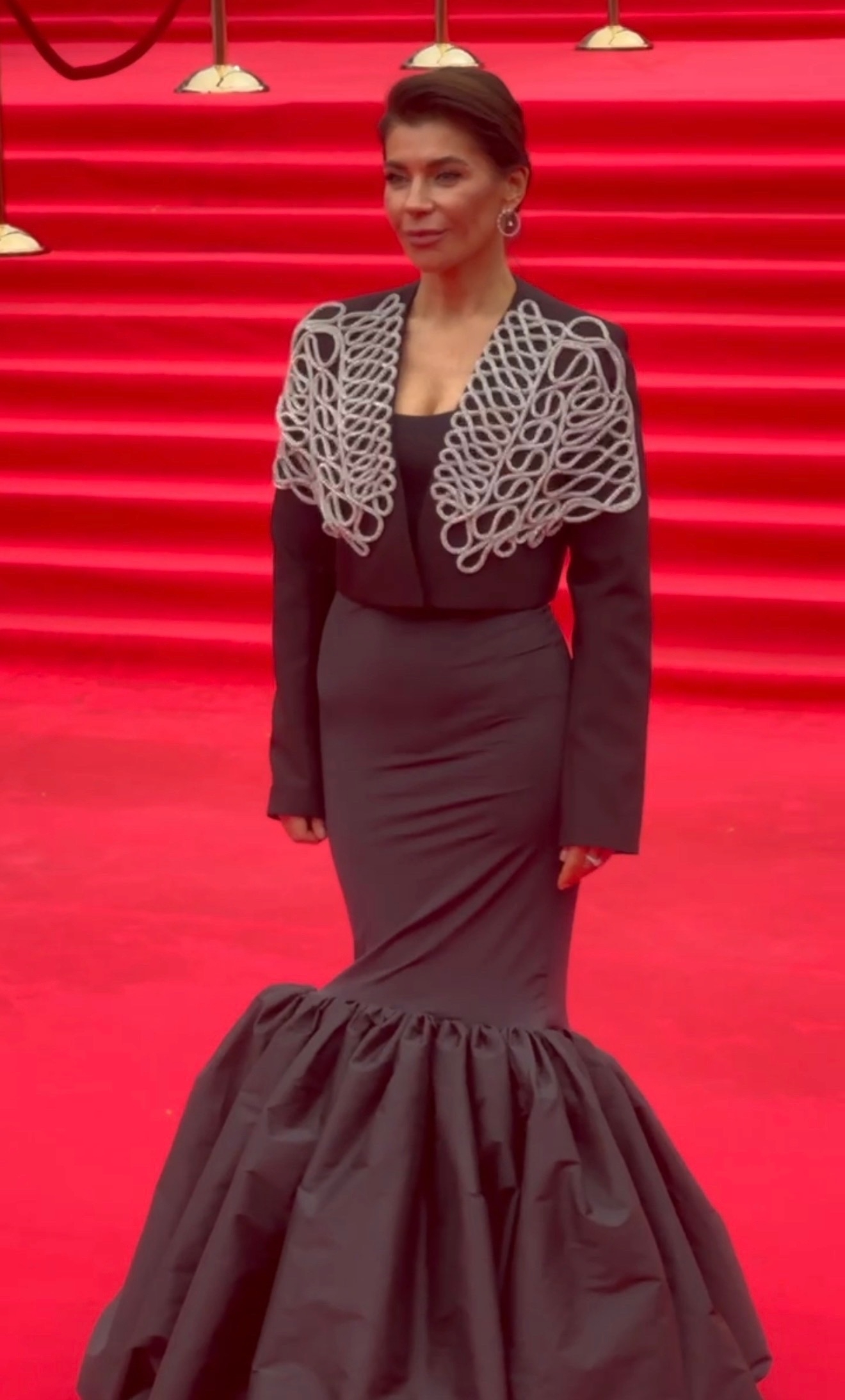 Актриса появилась в эффектном вечернем образе. На ней длинное тёмное платье силуэта «рыбий хвост» — облегающий верх и расклёшенный низ с объёмной юбкой. Отличительная особенность — декоративный элемент на плечах: объёмная ажурная накладка светлого цвета, напоминающая вязаный или плетёный узор. Этот контраст создаёт яркий акцент.