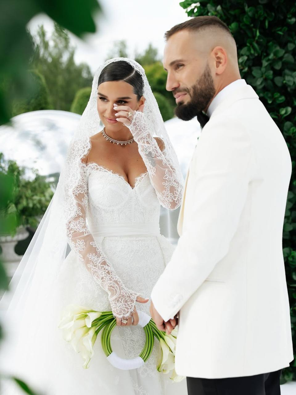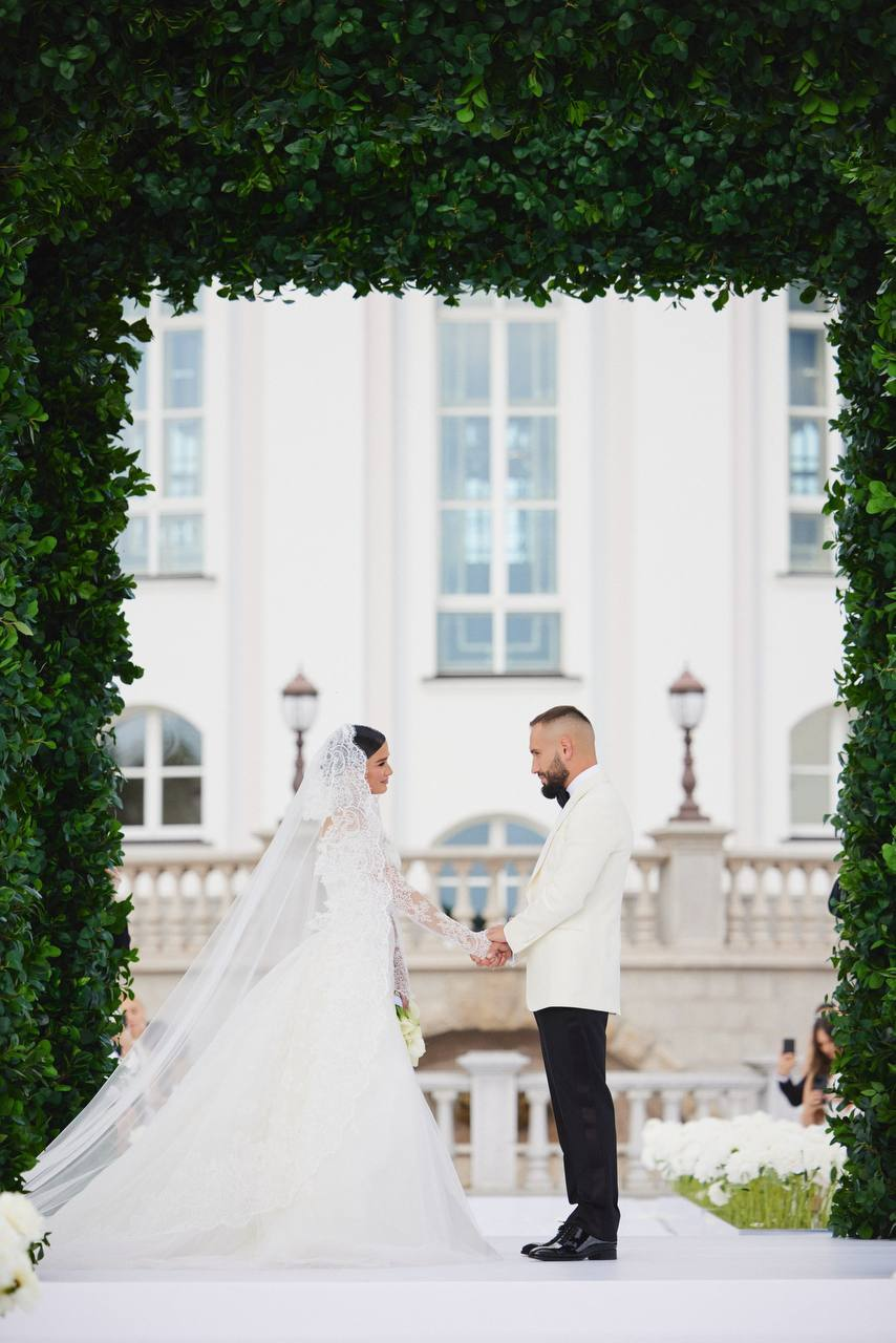 Всё в этот день было пронизано единой стилистикой. Свадебный наряд Ксении гармонично сочетался с итальянской темой. Невеста предстала в белом платье с изящной вышивкой и длинным шлейфом, которое подчёркивало её женственность, дополнив образ кружевной фатой. Жених, Николай Сердюков, поддержал стилистику своей избранницы, выбрав для торжества пиджак молочного оттенка и сделав акцент с помощью элегантной чёрной бабочки. Букет невесты, составленный из лилий, также идеально вписывался в общую концепцию оформления праздника. Пространство усадьбы было декорировано с использованием большого количества зелени и крупных зеркальных шаров. Особое внимание привлекла арка, под которой проходила церемония, — её сплели из множества зелёных лиан, создав романтичную и естественную композицию. Всё это позволило предположить, что цветовая гамма всего мероприятия была выдержана в свежих зелено-белых оттенках.